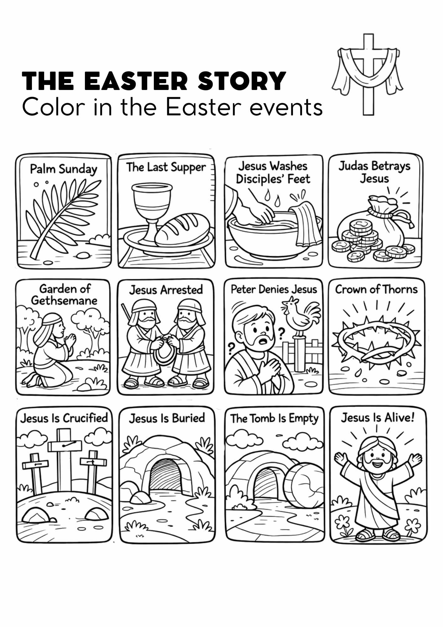 This beautifully designed Easter Bible story printable walks kids through the most important events from Palm Sunday to the Resurrection. With 12 easy-to-color panels, children can see the full story unfold in a simple and meaningful way.